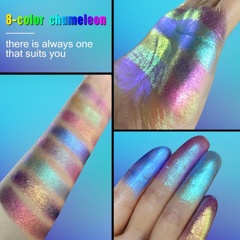 - High Impact Multi-colors Shift Eye Looks: Elevate your eye makeup game with our Multichrome Metallic Eyeshadow, offering stunning color shifts in blue, purple, and silver for mesmerizing eye looks that stand out.