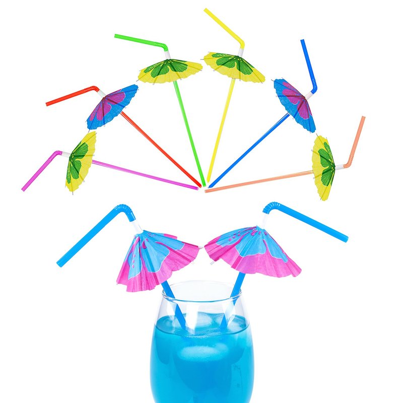 - Colorful bendy straws are designed with tropical colored hibiscus print on each paper umbrella. Comes in a package of 48 tropical mini umbrella straws. A better and practical party supply item than the ordinary cocktail umbrella!
