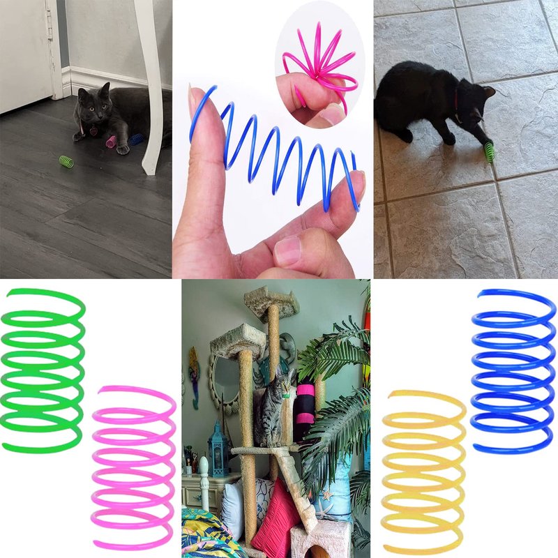 - Bouncy plastic springs toy: The size of platic spring is about 4cm in diameter, 4 bright color meet the cat's preferences-blue, green, yellow, pink, which suit for cat bite freely. Throw the spring toy on the ground, it's will bounce up and attractive cat's attention, make your kitten no longer lazy and like moving, full release the nature of cat.