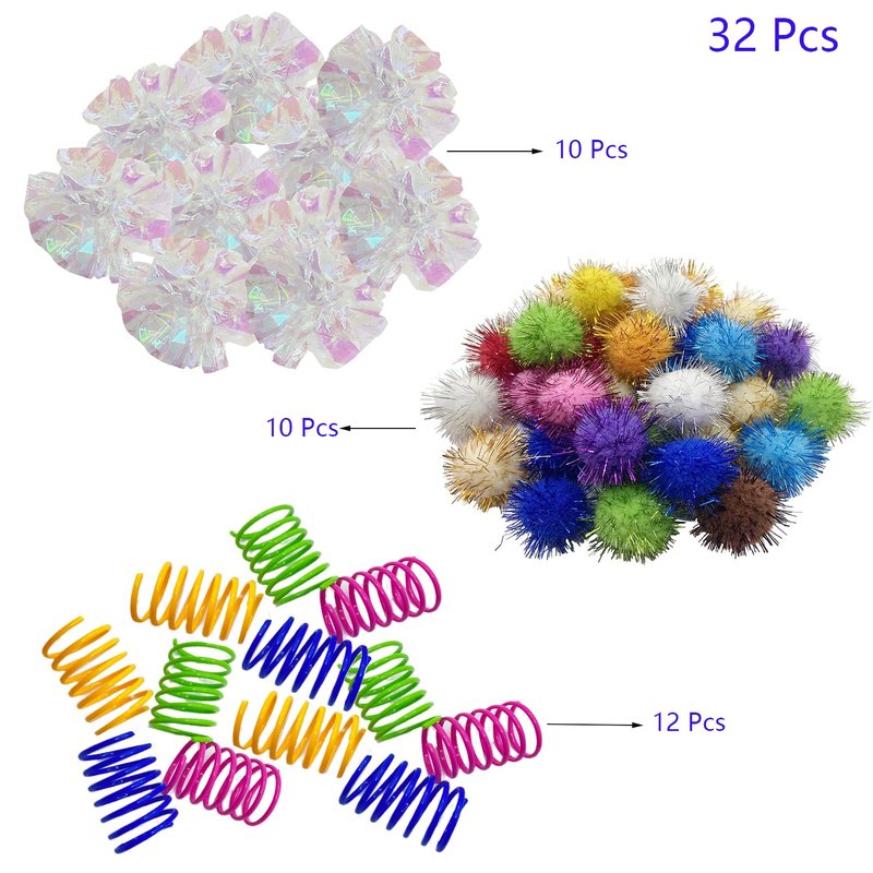 - Great Value - 32 pieces cat toys with 10 Pcs Cat Crinkle Balls, 10 Pcs Cat Sparkle Balls Color random, 12 Pcs Spiral Springs. Variety pack toys fit all cats needs.