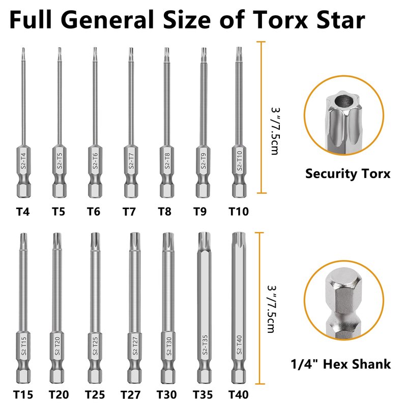 - WELL-EQUIPPED BITS SIZE - 14 piece torx screwdriver set in the following size: tamper proof torx bits of T4, T5, T6, T7, T8, T9, T0, T5, T20, T25, T27, T30, T35, T40