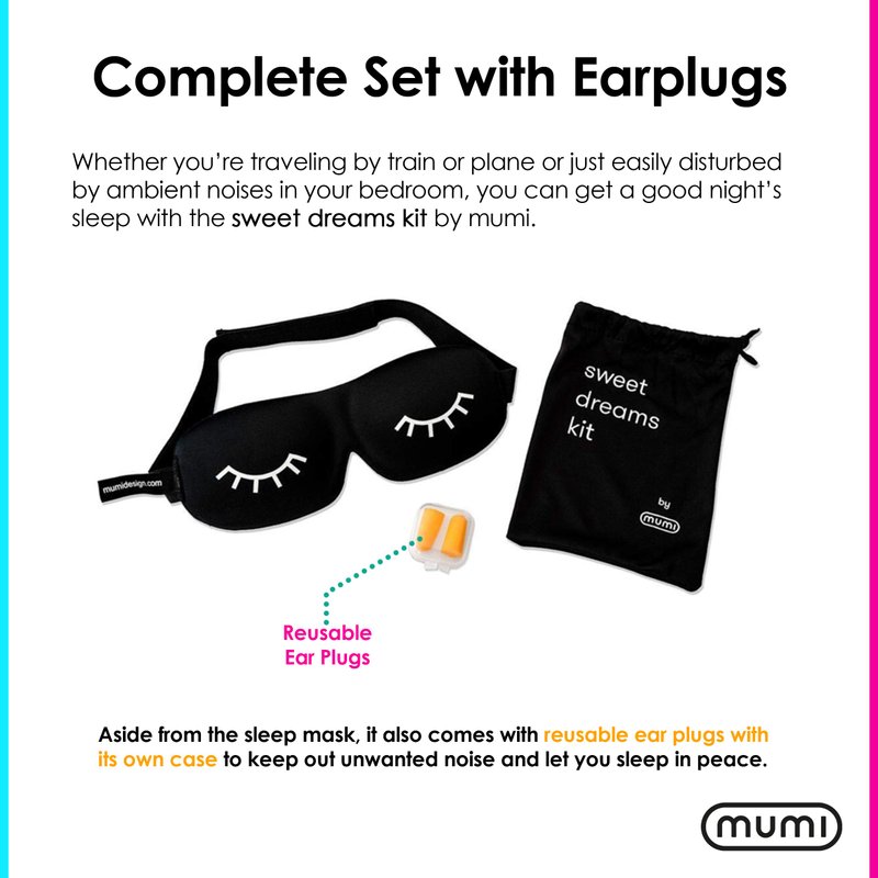 - COMPLETE SET WITH EAR PLUGS - Whether you’re traveling by train or plane or just easily disturbeb by ambient noises in your bedroom, you can get a good night’s sleep with the sweet dreams kit by mumi. Aside from the sleep mask, it also comes with reusable ear plugs with its own case to keep out unwanted noise and let you sleep in peace.