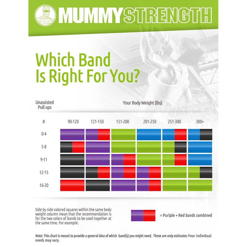 When using MummyStrength bands, don't worry about hitting the "1 set wall". Did you burn out your arms on your first set? No problem! Simply loop the black band over the bar and keep going. Need more assistance? Use the purple band, or whichever thickness lets you keep pushing forward.