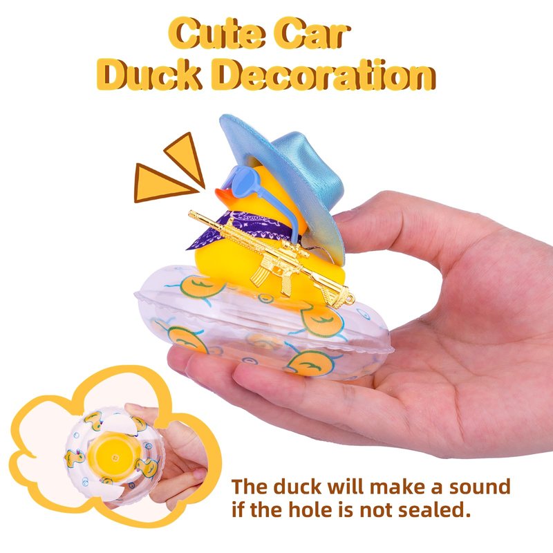 - 🐤 BRAND NEW&UNIQUE DUCK: The cowboy car duck is equipped with a holographic cowboy hat, a special prop on the left, a swim ring, a scarf and sunglasses. It is a unique dash duck to add more fun and bring a smile to your face.