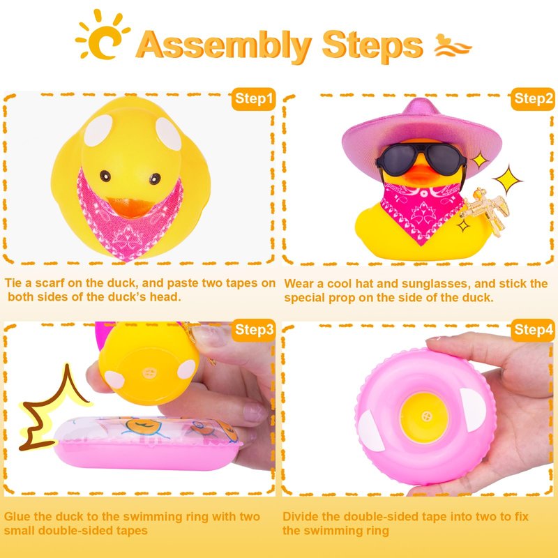 - 🐤 The Fun of DIY: Tie a scarf, put on the glasses, fix the special prop with tape, stick the hat on the duck's head with 2 small tapes, stick the rubber duck on the swim ring, and then fix the swim ring with double-sided tape. If you have any questions, please feel free to contact us at any time.