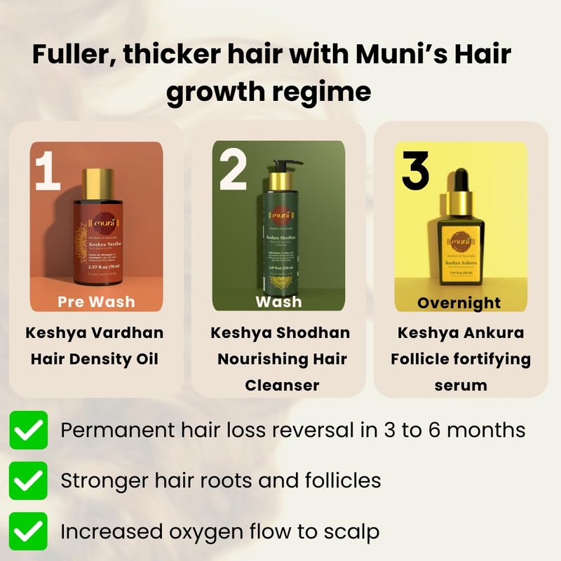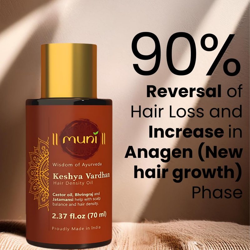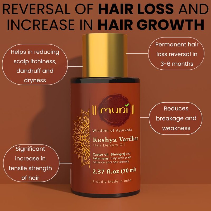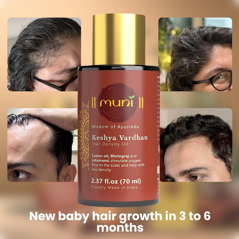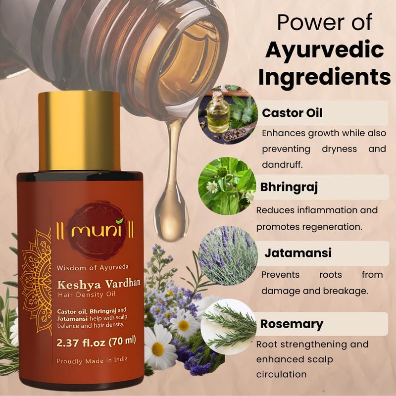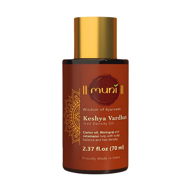 Introducing Muni's Prewash - Keshya Vardhan Hair Growth oil (2.37 fl.oz, 70 ml). Infused with Castor oil, Rosemary oil, Bhringraj, Amla, Argan oil, Coconut oil, Sesame oil, Jatamansi, Brahmi along with other potent Ayurvedic herbs which stimulate oxygen flow to the scalp and prolong hair growth phase, while acting as natural DHT blockers preventing shrinking of hair follicles and hair loss.