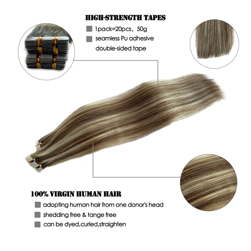 - 【High-Strength Tapes & Easy to Take Out】-- Specially developed high-strength invisible tape. You can refer to our product page to take out the tapes. Tape in hair extensions specification: , 20 Pieces, weight 30g -70g,14-24inch available. Recommend 2-3 sets for thick full head.