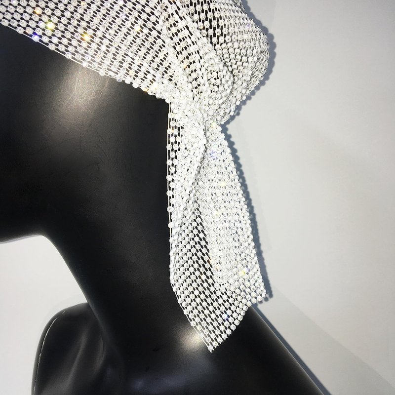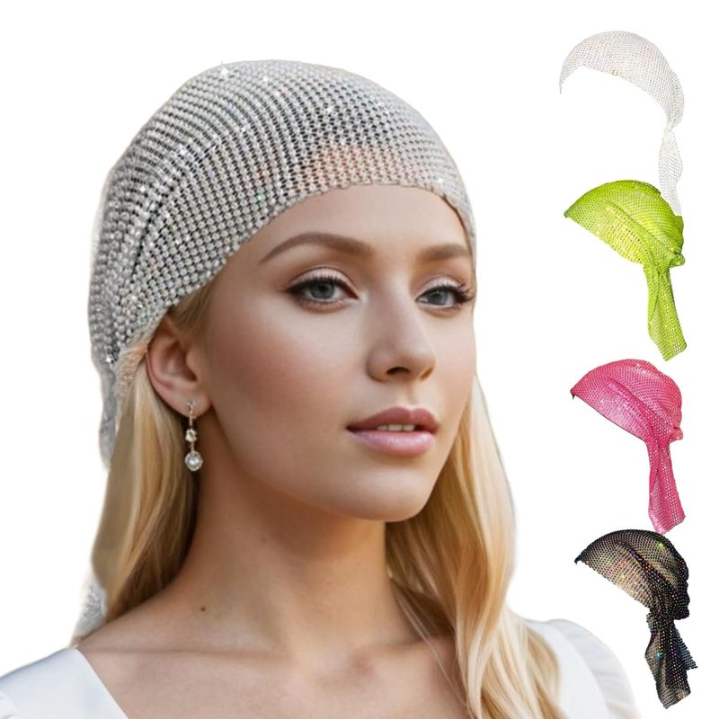 Munyee Hua Rhinestone Head Scarf for Women Bling Sparkly Hijab Stretchy Rave Turban Hat Headband Crystal Mesh Cap Hair Snood Nets Vintage Dress Concert Headpiece(White)