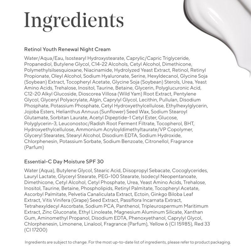 Your value set includes a full-sized Essential-C Day Moisture SPF 30, a daily dose of radiance-boosting hydration, plus broad-spectrum sunscreens to shield skin from UV rays; and a full-sized Retinol Youth Renewal Night Cream, a nighttime moisturizer with 3 types of retinol to smooth away early signs of aging and encourage renewal while you sleep