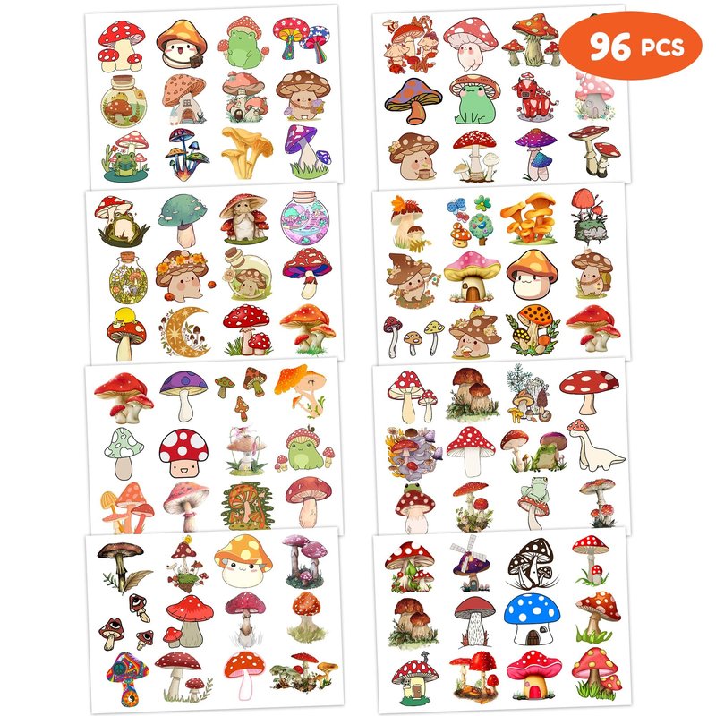 - 🎉🍄【PERFECT TATTOOS FOR THEMED MUSHROOM DECORATIONS】: MUSHROOM temporary tattoo stickers include 8 sheets in total. There are 96 Pcs super cute tattoo differences. Perfect for giving out party favors and holiday theme small gifts. The size of each sheet is 6.1 * 3.1 inches. One size fits kids.