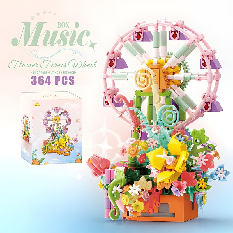 Music Box Flower Building Block(364pcs) Set Rotating Ferris Wheel Diy Building Toys For Kids Adults Display Collection Creative Home Office Gift For Christmas Birthday New Year Valentine's Day