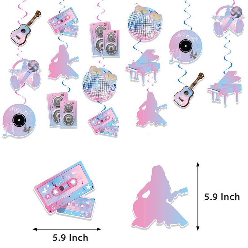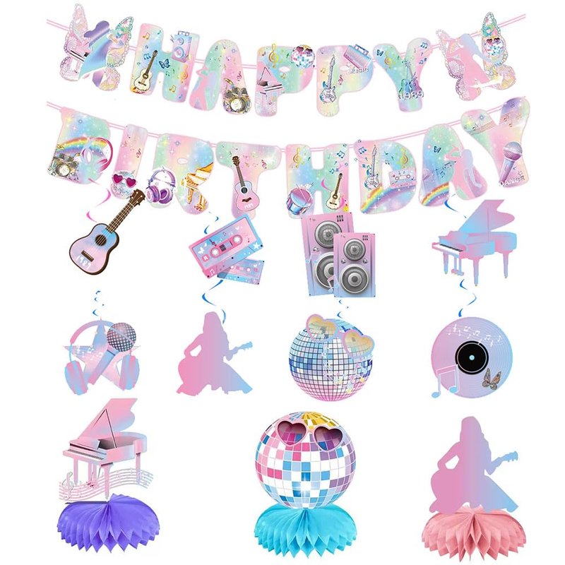 - package: I piece of Popular Party Decorations banner and 8 pieces of Popular birthday hanging swirl decorations. There are 8 different designs of paper cutouts and 8 pieces foil hanging swirls. 3 pcs Music Party Honeycomb Centerpieces,The paper is of high quality,and not easy to bend. They can go through your birthday party for sure and even can be used for many times
