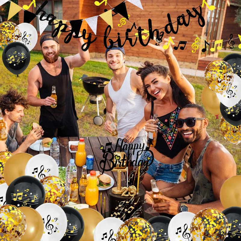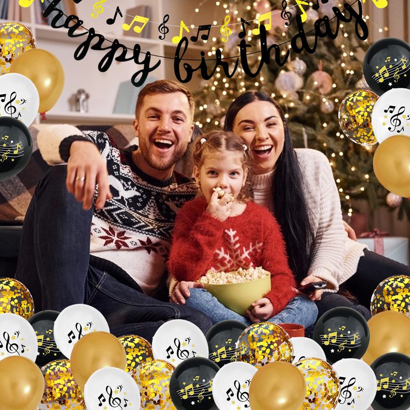 - Quantity: You will receive 1 triangle flag banner, 1 happy birthday banner, 1 musical note banner, 1 happy birthday cake topper, 10 black latex balloons, 10 white latex balloons, 5 gold latex balloons and 5 gold confetti balloons, rich in type and quantity to meet your need for an impressive music themed party.