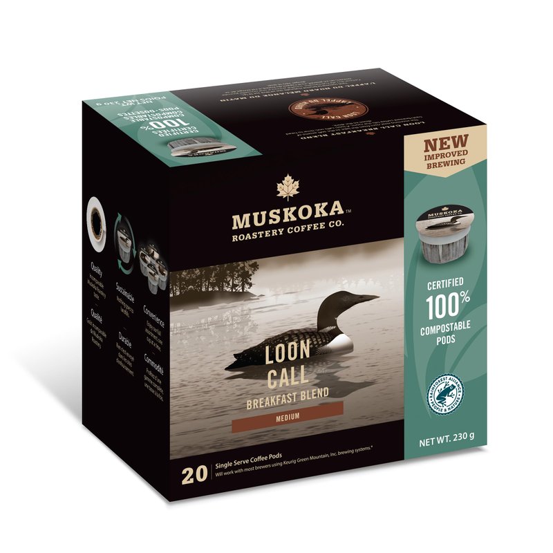 The morning mist rises from the lake as the soft aroma of fresh-brewed coffee fills the room. A loon calls out; time to head down to the dock. Technically, we should have named this coffee Loon Calls because the common loon found in Muskoka actually has four distinct calls - the tremolo, wail, yodel, and hoot. The tremolo, which sounds like a crazy laugh, is the most familiar and distinctive call, and is used to signal alarm or worry. You are more likely to hear the wail in the morning, as you enjoy your coffee and danish, when loons signal that they want to move closer together or that it is safe for the chicks to join them for food. The pods are made using world-leading PurPod100 technology developed by the Canadian licensor in collaboration with the University of Guelph’s Bioproducts Discovery and Development Centre. This Canadian innovation is the first, and to date only, coffee pod to earn certification from the Biodegradable Products Institute (BPI**). This confirms that the pods can break down in as little as 5 weeks in well-managed composting processes -- like most food waste. So, after enjoying a single cup of freshly brewed Muskoka Roastery coffee, the ring, lid, filter and brewed coffee grounds will fully compost into nutrients for the soil. As a proud Canadian company, committed to sustainable practices, we are delighted to offer the solution to a very real environmental problem, and equally proud that this innovation was developed and patented right here in Canada. Not for use with Vue brewer. Muskoka Roastery single serve coffee pods are not affiliated with nor approved by Keurig Green Mountain, Inc. Roasted in Canada: Muskoka Roastery is 100% owned + operated.