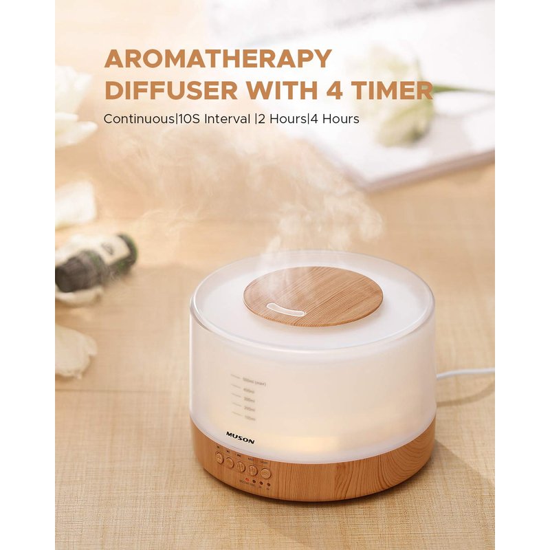 - 【Aroma Diffuser Humidifier】With 500ml large capacity water tank, this ultrasonic diffuser can humidify dry air for 8 to 13 hours with high/low mist, no need to refill water at night. You can also set the essential oil diffuser to intermittent mist that diffuses mist and pauses every 10s or set it to continuous/2 hours/4 hours mist to improve the air quality, cover up the smell of pets or smoking, care skin and protect your family from excessive dry air, microorganisms, allergens, dust, etc.
