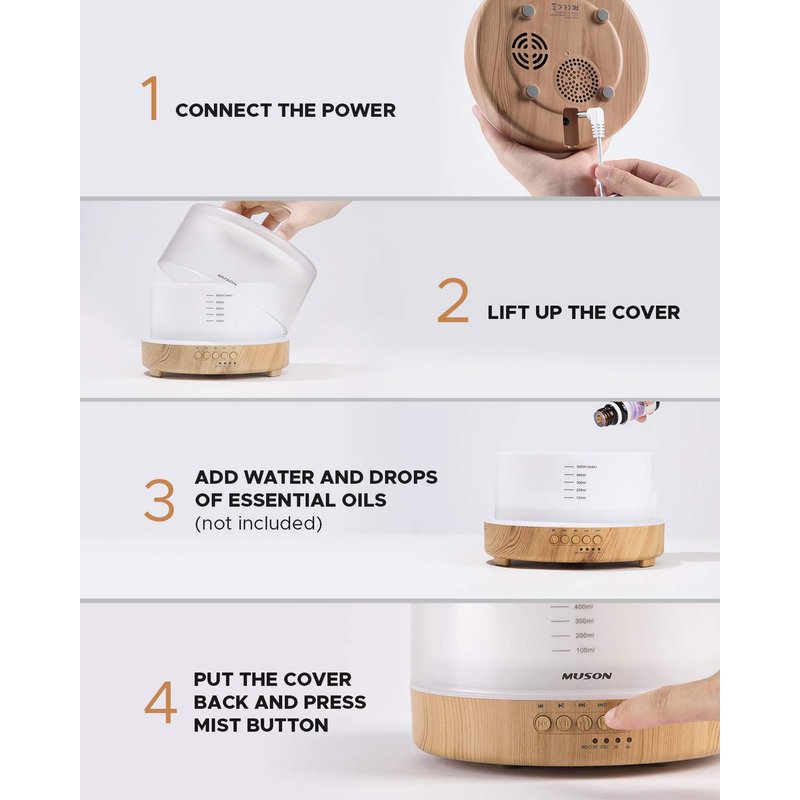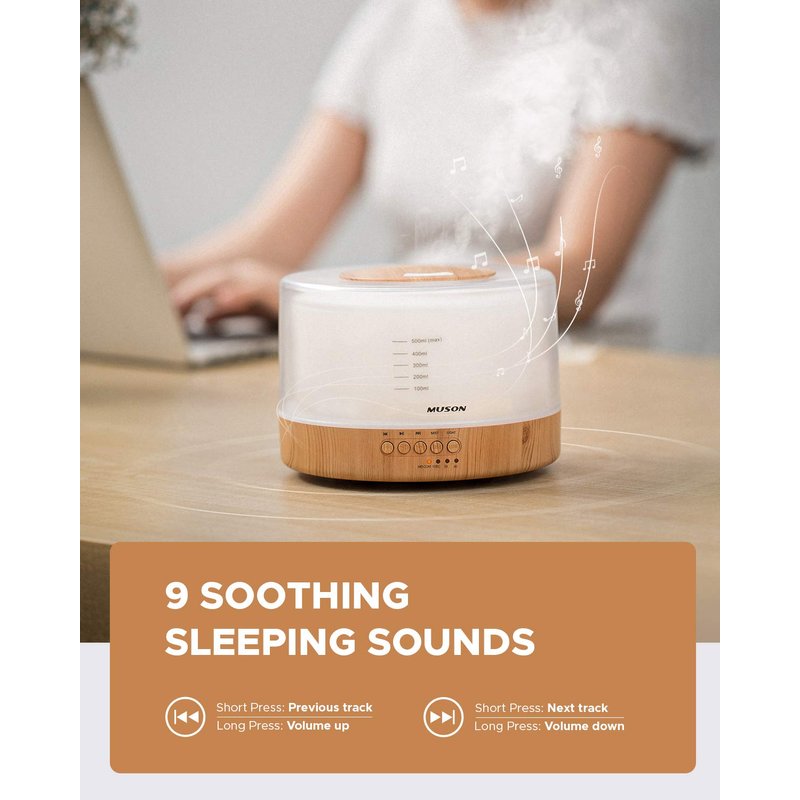 - 【Sound Machine Diffuser】6 natural sounds, white noise and 2 piano music along with aroma mist help you fall asleep more easily, improve your sleep, and make you refreshed. The white noise sound is also very suitable for office privacy and covering up the background noise, like blocking noisy neighbors, growling dogs and hitting sounds. Note: you can play/pause the music while diffusing essential oil and adjust the volume by long pressing the forward and back button.