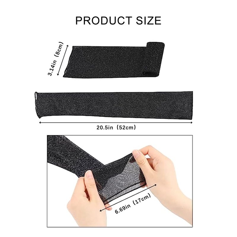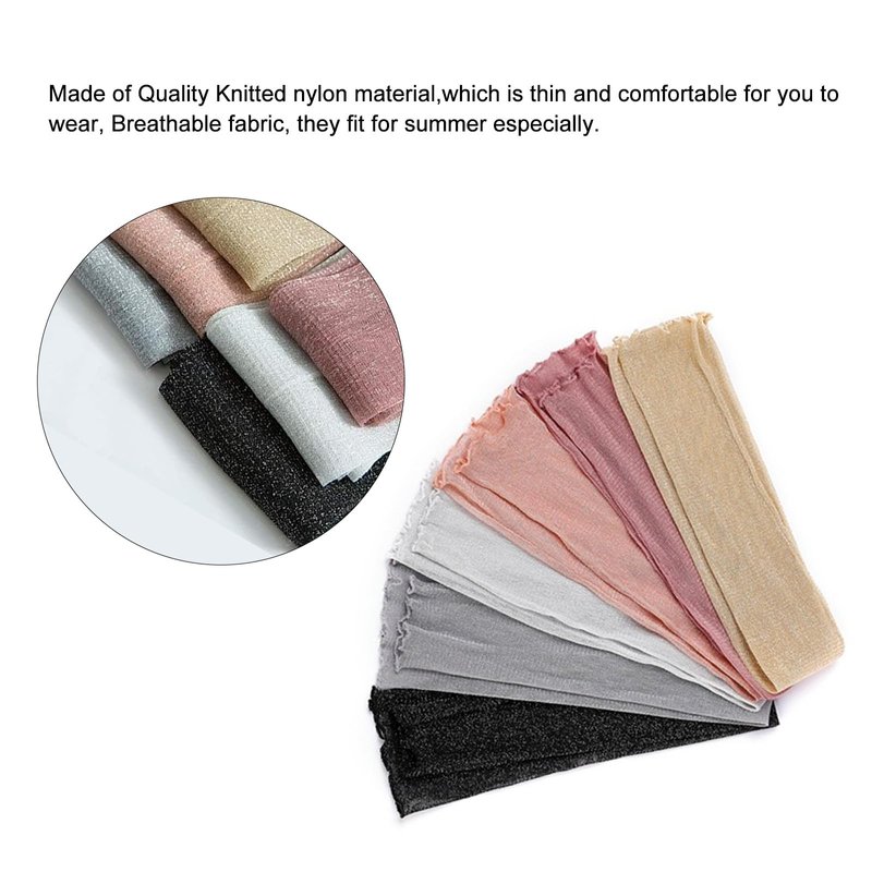 The material of this MUYDZ women's long arm sleeves is nylon + gold and silver wir, the length is 20.5 inches. It is excellent flexibility, no restraint, refreshing fabric, comfortable and breathable, and can prevent the sun.