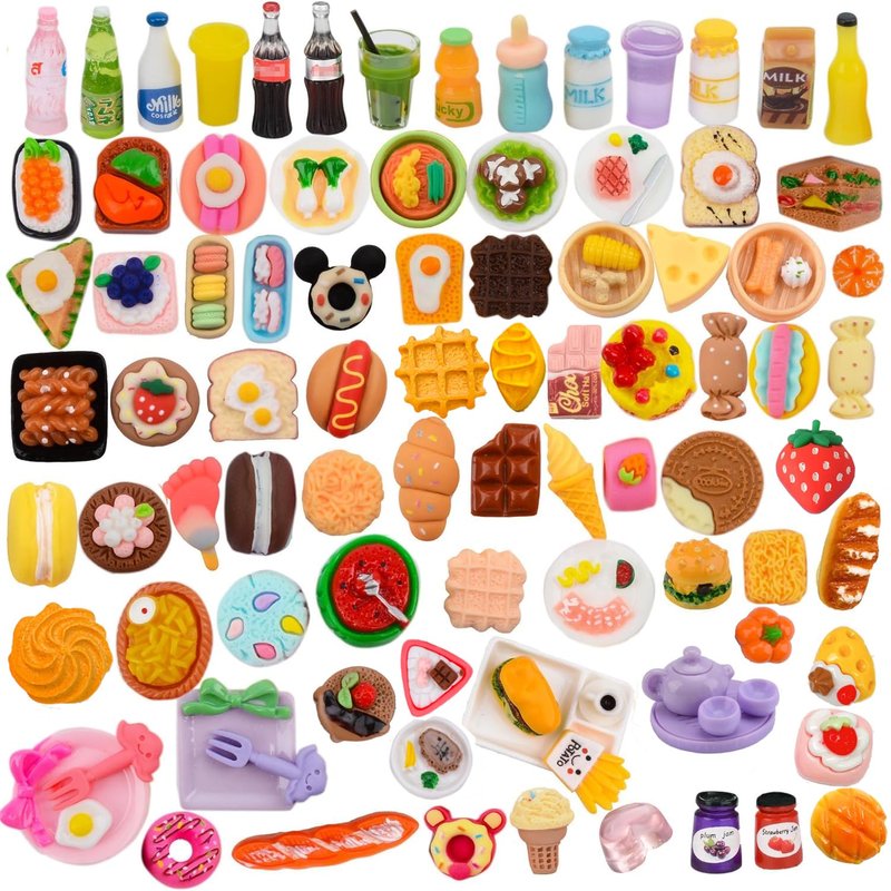 - Miniature Food Drinks Bottles Toys— 100 Pieces+Storage Box ,Includes various styles different cute food toys set, such as mini food, drink bottles, coffee, burgers, French fries, cakes, bread, chocolate, ice cream, milk, trays, fork etc. It's WYSIWYG, the styles are basically consistent with the picture, not random.