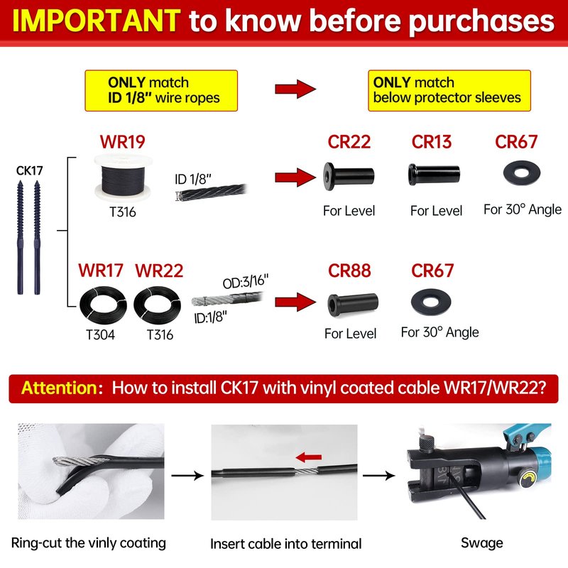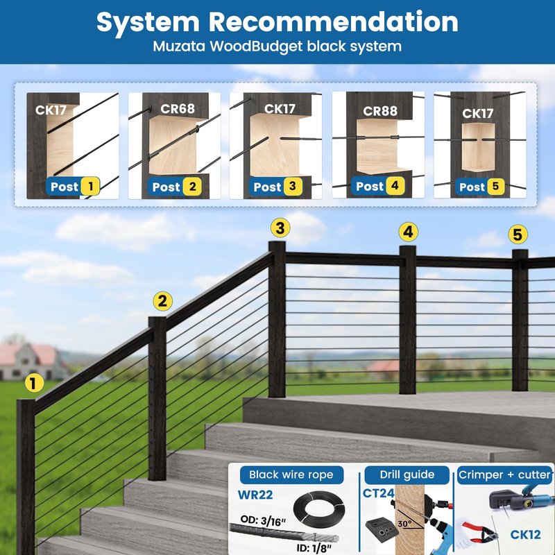 - Advice for constructing a system - To help you build a cost-effective black INDOOR cable railing system more efficiently, we recommend the following product combinations from Muzata, including 1/8" swage lag screw CK17 black, hydraulic crimper and cable cutter CK12, drill guide CT24, black level protector sleeve CR88 black angle protector sleeve CR68, black wire rope WR22