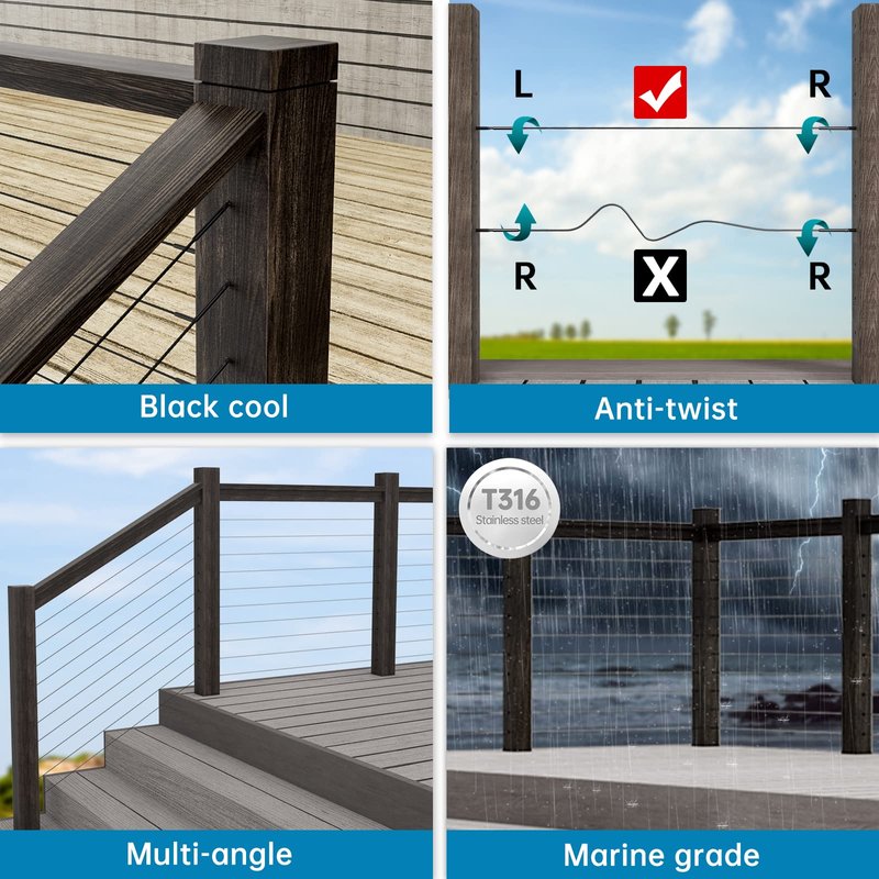 [shortdesc] New tech plating - High-quality durable black coating is designed to work in outdoor conditions and never fade for over 10 years. The coating is Anti-UV and wear-resistant. We also have black posts, handrails, tensioners, and wire ropes for building cool black railings. Search "muzata BR1" to find them. Marine-grade - Made of T316 stainless steel, super rust-proof. Weather protection and works for coastal projects. The black coating enhances the corrosion resistance. Left & Right : This Cable Railing kit set includes Left hand lag screws 20pack and right hand lag screws 20pack. It will rotate wire rope to the same direction, which resolves the problem of twisting the wire rope. Products without Left & right will bring you that hassle and might damage the cable Easy : Easy to install . Do it yourself by folllowing our video. Orientation : For horizontal installation. [/shortdesc] Material T316 stainless steel Product type for 1/8" cable; for wood post ; Dimensions Check the images above Items included lag screw left hand x10; lag screw right hand x10; Cable railing tutorial videos fittings for metal post fittings for stair railing cable railing tools Cable railing installation videos fittings for wood post fittings for deck railing cable railing wire ropes