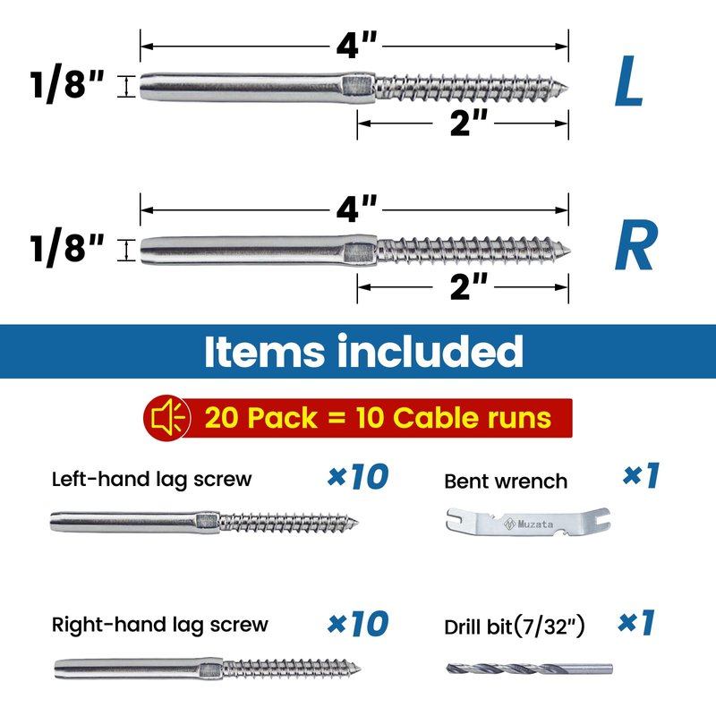 - Left&Right Feature - Package comes with 10 left and 10 right hand lag screws for 10 cable runs, 1 drill bit, and 1 bent wrench. This cable railing kit is designed to rotate wire rope in the same direction to avoid twisting or damaging the wire rope. Professional hydraulic crimper Muzata CR09 is recommended