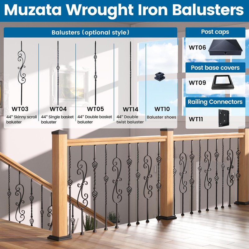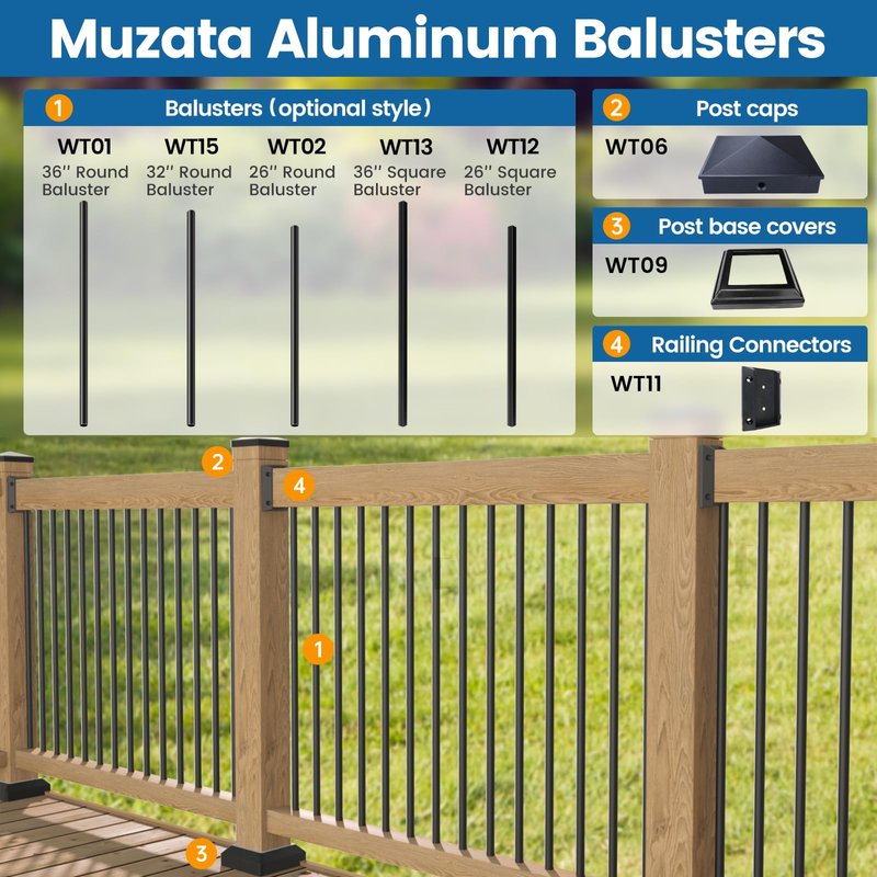 - Wood railing system - You might need several wood railing kits to build a complete frame to enrich your deck railing system. Please search Muzata WT01 for 36" round aluminum balusters, WT02 for 26" round aluminum balusters, WT03 for s-shaped scroll balusters, WT04 for single-basket balusters, WT05 for double-basket balusters, WT06 for aluminum post caps, WT08 for deck railing connector, WT09 for one-piece post base, WT10 for flat square baluster shoes