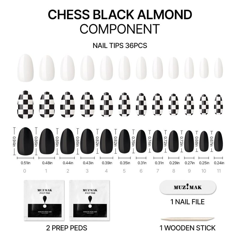 - COMPLETE FAKE NAIL KIT: Everything you need for a flawless manicure experience! Our press on nails kit includes 36 nail tips in 12 sizes, 2 prep pads, 1 nail file, and 1 wooden stick for easy application and removal.