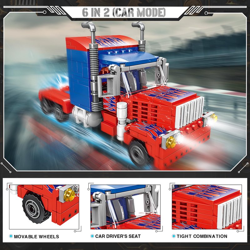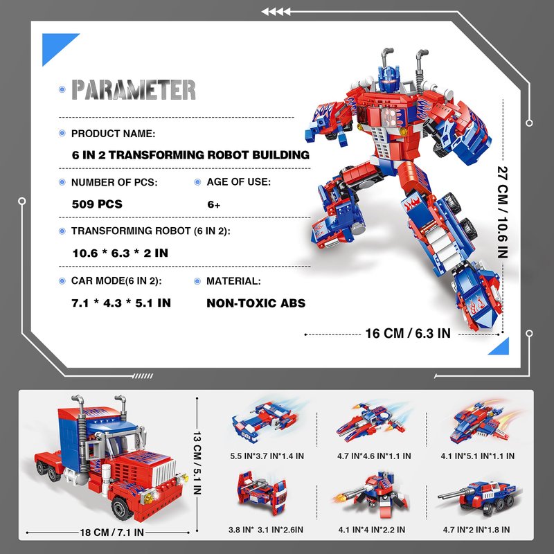 - 【6 in 2 Transform Suit】6 in 2 transforming robot building sets can be assembled not only into a robot, but also into an independent truck (but it must be disassembled and rebuilt). The shape is highly realistic, with picture instructions and stickers. The steps are clear and easy to understand, and all parts are packed in different boxes according to the numbers.