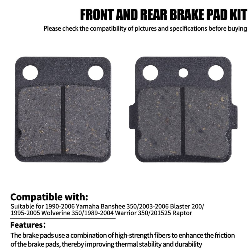 - Compatibility - Replacement Brake pads fit 1990 1991 1992 1993 1994 1995 1996 1997 1998 1999 2000 2001 2002 2003 2004 2005 2006 Yamaha Banshee 350 YFZ350,2003 2004 2005 2006 Yamaha Blaster 200 YFS200,2011 Yamaha Raptor 125 YFM125R,1989 1990 1991 1992 1993 1994 1995 1996 1997 1998 1999 2000 2001 2002 2003 2004 Yamaha Warrior 350 YFM350X,1995 1996 1997 1998 1999 2000 2001 2002 2003 2004 2005 Yamaha Wolverine 350 YFM350FX 4x4