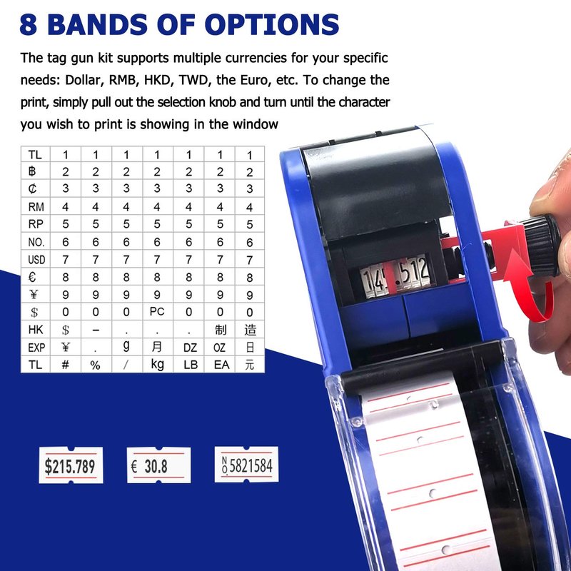 - [Sufficient content] This price sticker gun is printed in a single line of 8 digits. Price tags gun can print price, product code, production batch, date, discount, weight, quantity, etc. A variety of currency signs are available: US dollar, Euro, RMB, Hong Kong Dollar, etc. Common currencies can be used.