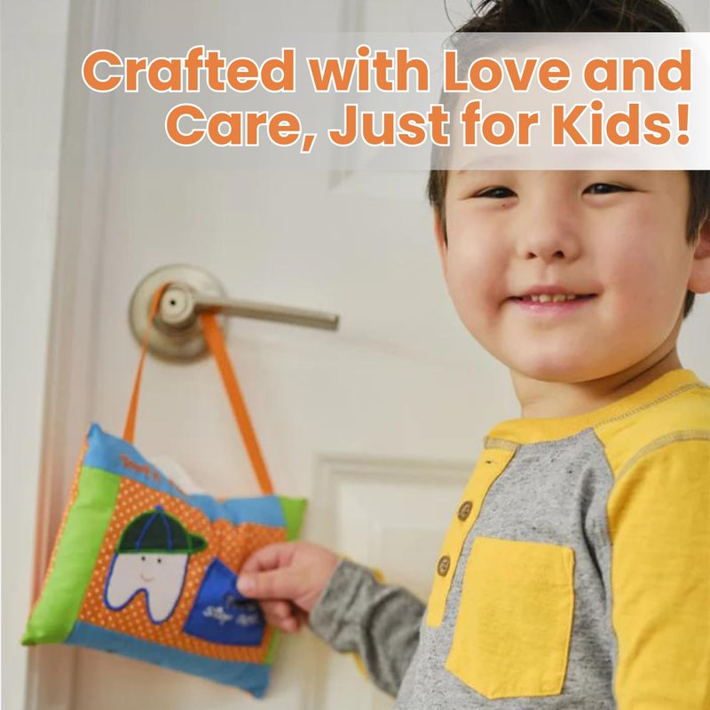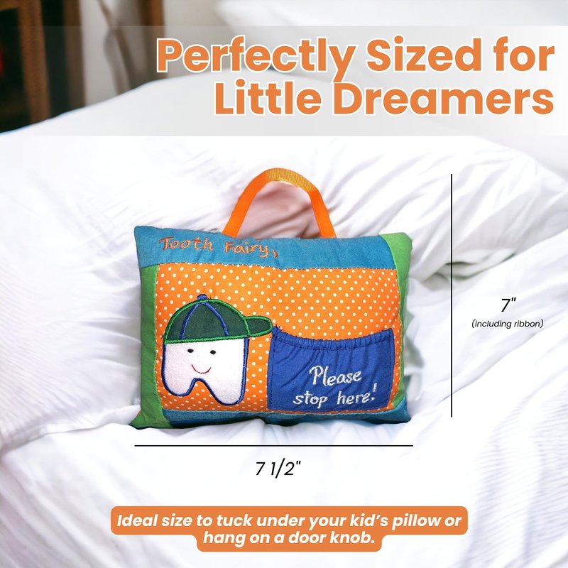 - ADORABLE TOOTH FAIRY PILLOW. This delightfully charming orange polka dot Tooth Fairy Pillow is designed specifically for your little man. Featuring quality embroidery, with a darling felt tooth motif and tooth holding pocket, its an enchanting addition to any little guy's bedroom. The best feature is that it hangs from a door knob or bedpost to make it easy for the Tooth Fairy to exchange the tooth for a prize! Your child will look forward to a visit from the Tooth Fairy with the start of the fi