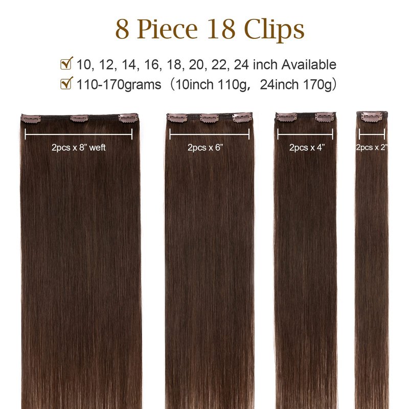 - 8PCS FLEXIBLE TO USE - real hair clip in extension is in a set of 8pcs,different length of wefts apply in different hairzone both sides and back of your head. Recommend: use 1-2sets to thicken your hair, 2-3sets if you like heavy volume.