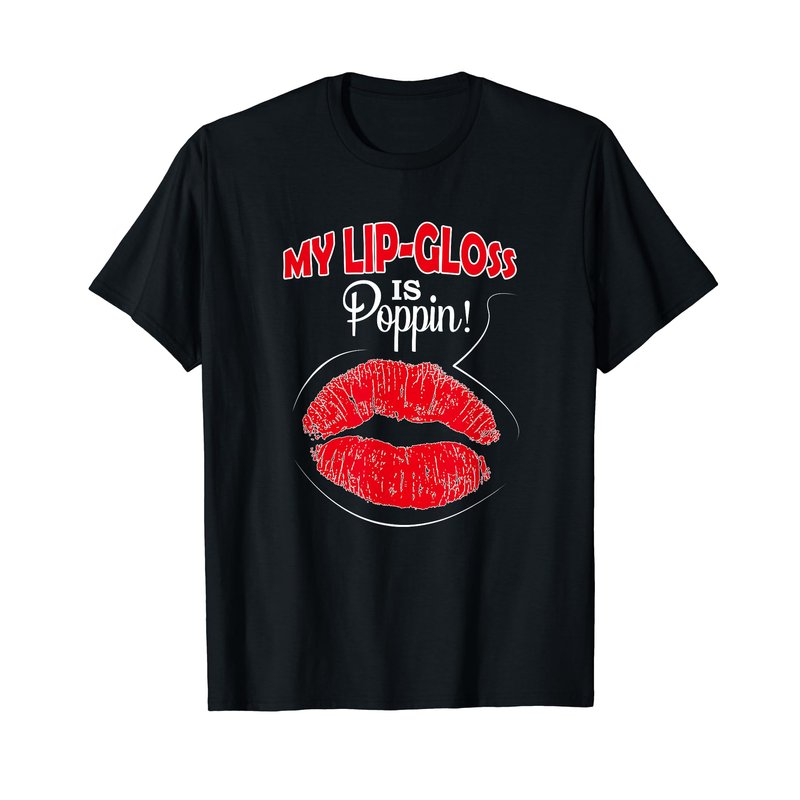 - To add to the glamour or you shiny lips this My lip gloss is poppin t shirt comes with a beautiful kiss lips in complete red lipstick or gloss effect. Great gift for the kissable mouth in your life