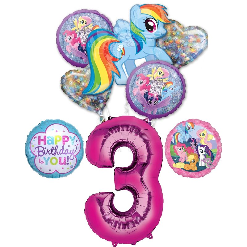 - (1) 34" Giant Pink Number 3 Foil Balloon, (1) 28" My Little Pony Dash Shape Foil Balloon, (2) 18" My Little Pony Friendship Adventure Round Foil Balloons, (1) 18" My Little Pony Group Round Foil Balloon, (1) 18" Pink and Teal Happy Birthday To You Foil Ballopon and (2) 19"Shimmering Holographic Heart Foil Balloons. Inflate balloons same day of event. Ribbon Not Included. All Anagram Licensed Foil Balloons are Made in USA. Founded in 1977, Anagram International leads the world in innovating and manufacturing foil balloons.