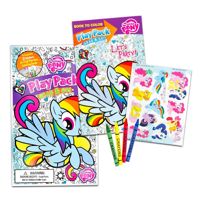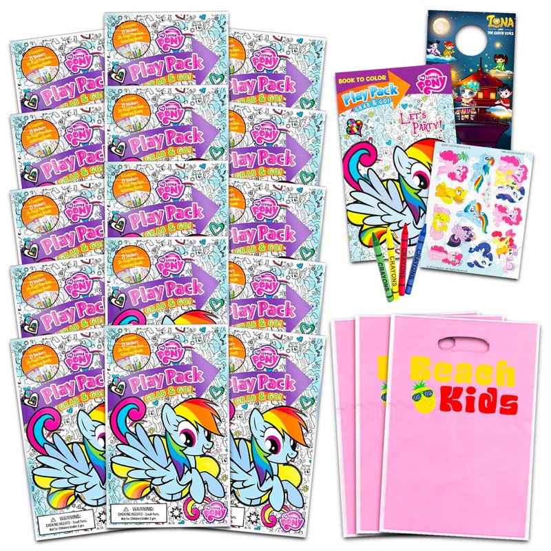 My Little Pony Party Favors Set - My Little Pony Bulk Party Favors Bundle With 15 My Little Pony Play Packs for Party Supplies | My Little Pony Coloring Book, Activity Book. My Little Pony art coloring book set features favorite characters like Pinkie Pie, Fluttershy, Rarity, and more. Toddler coloring books Grab and Go fun for car travel & vacations. Fun for holidays, Easter basket, birthdays, and prizes. Cool party favors, supplies, art gifts, and presents. Good grade school toddler coloring book for classroom rewards and giveaways making it the best coloring book set. Kids coloring books activities for daycare, camp, parties, pre-school, kindergarten, birthday parties, coloring books for kids sleepovers, etc. Fun for boys and girls. Bulk set in resealable bags, ages 3+, especially popular party favors for kids under 5. Officially licensed My Little Pony toys and games products also comes with pink loot bags and a Luna and the Cloud Elves door hanger.