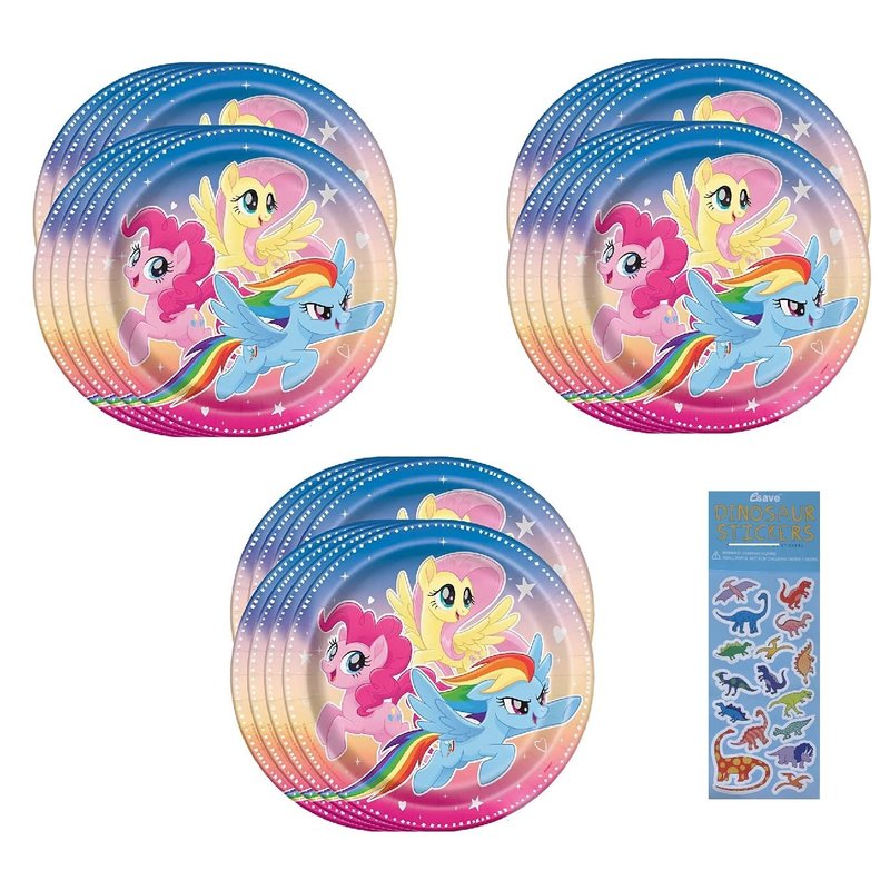 My Little Pony Party Supplies Bundle Pack includes 24 Lunch Paper Plates 7" and 1 Esave Dinosaur Sticker Sheet (not Pony stickers).