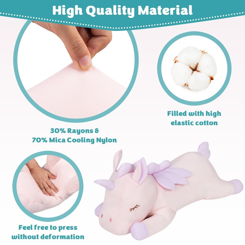 - Premium & Safety Material: This cooling stuffed animal pillow is made of comfortable and skin-friendly 30% rayons & 70% mica cooling nylon, and are filled with high elasticity PP cotton. Approximately 24 inches in length. The workmanship is fine and firm. Surface washable.