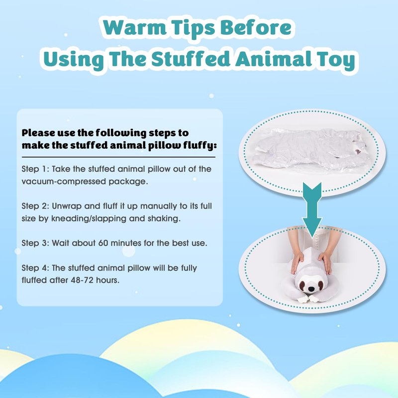 - Important Note: The stuffed animal pillow is vacuum-packed. After opening the package, gently knead/slap and shake the plush with your hands to disperse the stuffing, then the pillow will be automatically fluffy. The chill cuddle pillow will be fully fluffed after 48-72 hours.