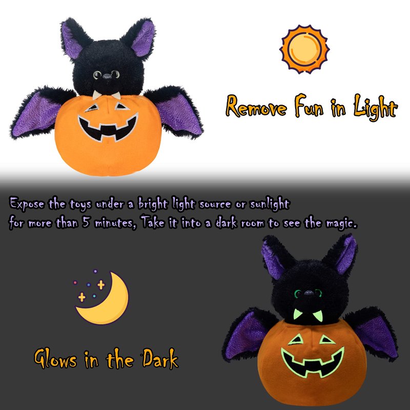 - 🎃Adorable Image: Cuddly Plush Bat stay in Pumpkin. Plush Pumpkin Glow in the Dark. Delicate workmanship and Plush Bat can be remove from pumpkin.