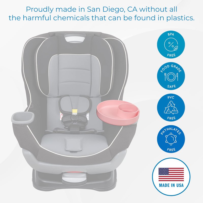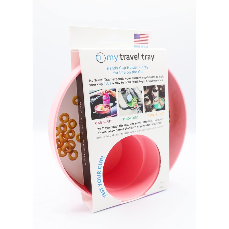 My Travel Tray utilizes your current cupholder, keeping your kids snacks and drinks within arms reach while out and about, helping keep everyone a little bit happier. My Travel Tray fits most cars, car seats, strollers, boosters, beach chairs, shopping carts, anywhere you can locate a standard cup holder! Patented and made in the USA, dishwasher safe, free of BPA, PHT and PVC.