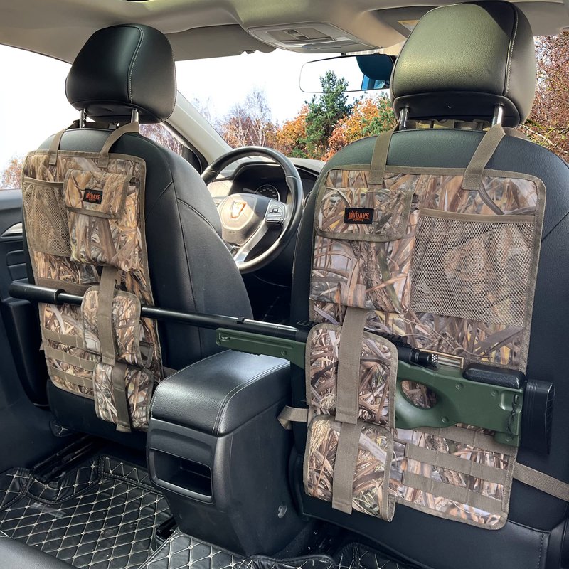 - SEAT BACK GUN RACK :The vehicle seat back protector featured with 2 headrest gun rack for hunting rifles or shotguns storage and organization, design to fit different length hunting guns, hold more security