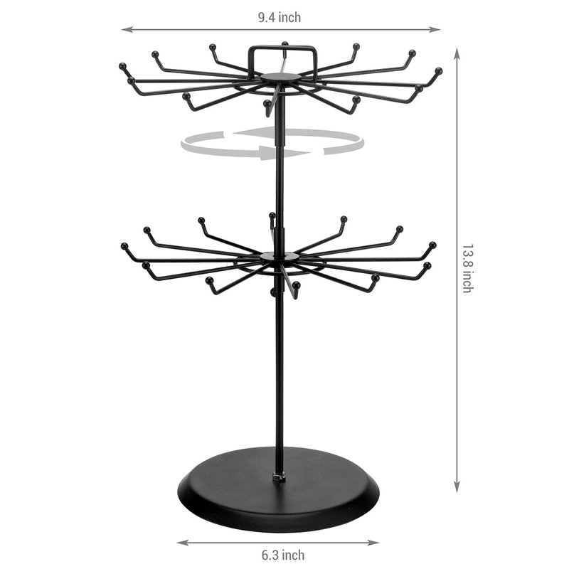 - Both top and bottom tiers feature 12 hooks each and spins 360 degrees, while the top tier is designed with a holder for photos, business cards, or simple hair clip holder; Perfect for holding a variety of necklaces and bracelets from your personal collection, retail settings or craft fairs