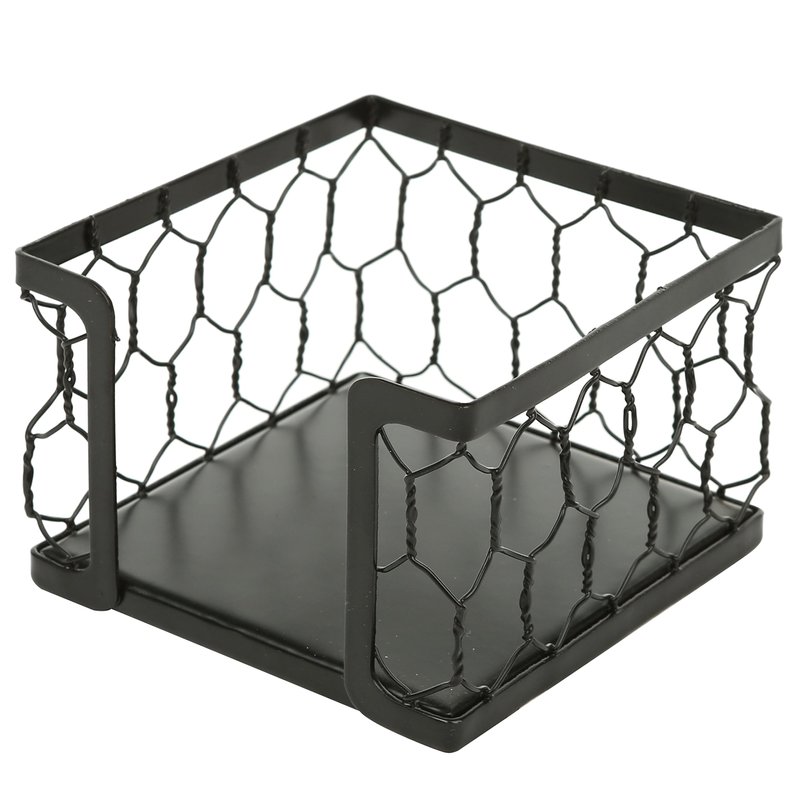 Keep your sticky note close at hand and well contained with this 3 X 3 note pad holder. Made with durable metal, this cube shaped dispenser features a rustic mesh chicken wire design. It's matte black powder-coat finish add an element of charm and luxury to any office desk. You can keep this square memo holder almost anywhere to quickly jot things down. While a wide opening makes it easy to replenish this container once all your memos have been taken care of. So go ahead and add organization and style to your home or office with this black metal note pad holder.