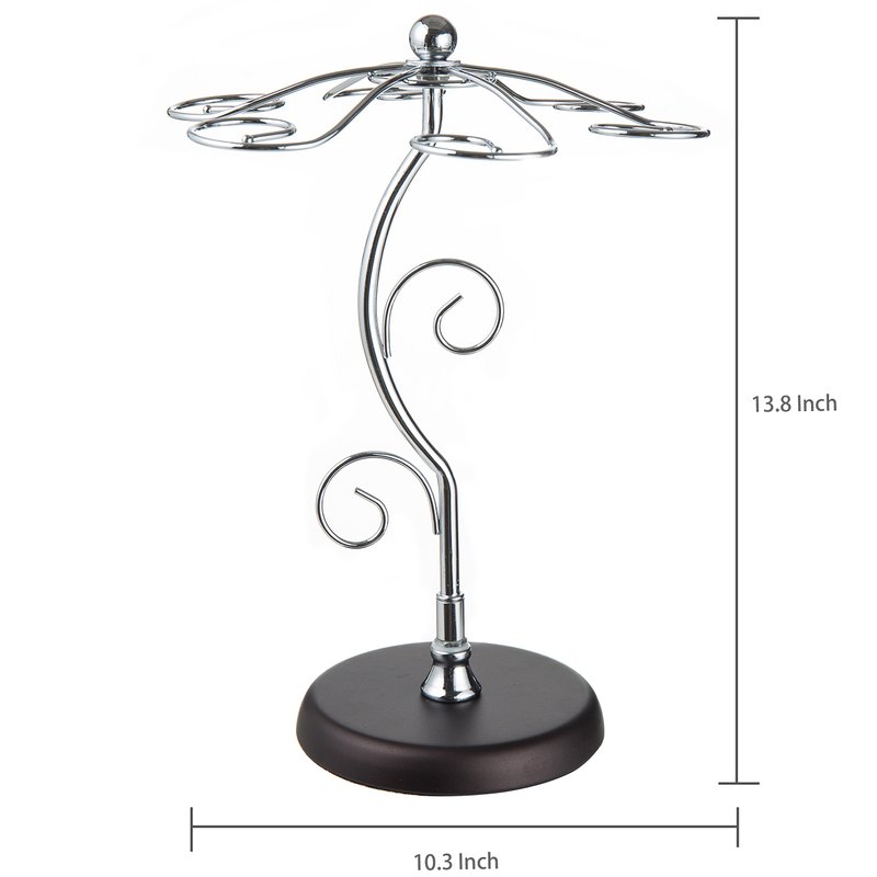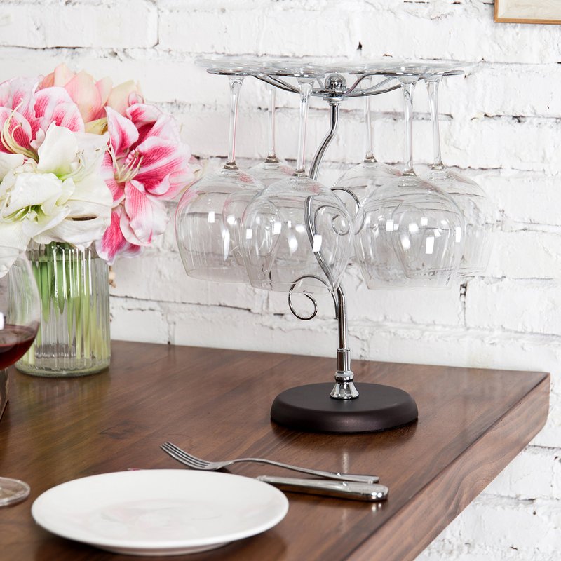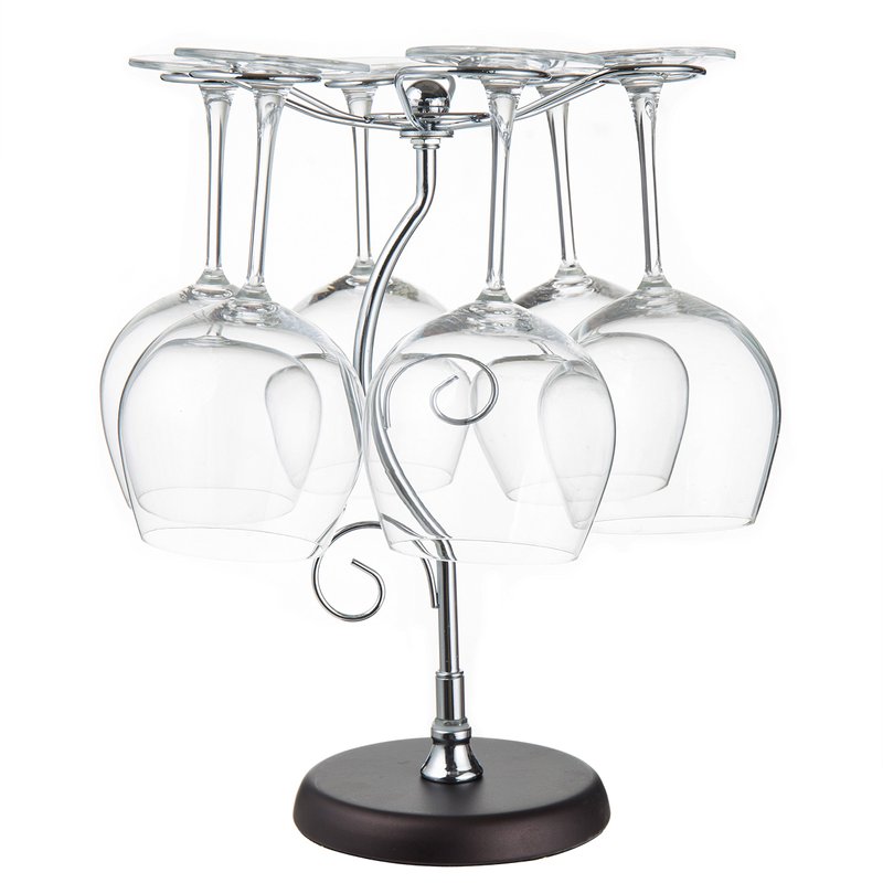 Keep your wine glass collection stylishly displayed with this beautiful and elegant rotating wine glass rack. Whether you’re entertaining or dining alone, this lovely metal wine glass rack keeps your wine glasses conveniently close at hand, thanks to a top section with enough curled horizontal hooks to securely hold up to 6 glasses. The stylish curves and shimmering chrome-tone metal that form this wine glass drying system make it a decorative accent as well as a sensible storage solution. This sturdy 6-glass wine glass rack can be easily moved wherever you need it, whether you’re displaying your glasses on your dining table or storing them on your kitchen counter or in a kitchen cabinet, and the sturdy base keeps this wine glass rack - and your wine glasses - stable and safe. Should you need to put it away, this wine glass drying rack can be disassembled easily for convenient storage. Use this wine glass stand to add classy style to your kitchen or dining room or give it as a thoughtful housewarming, wedding, bridal shower, birthday, or Christmas gift.