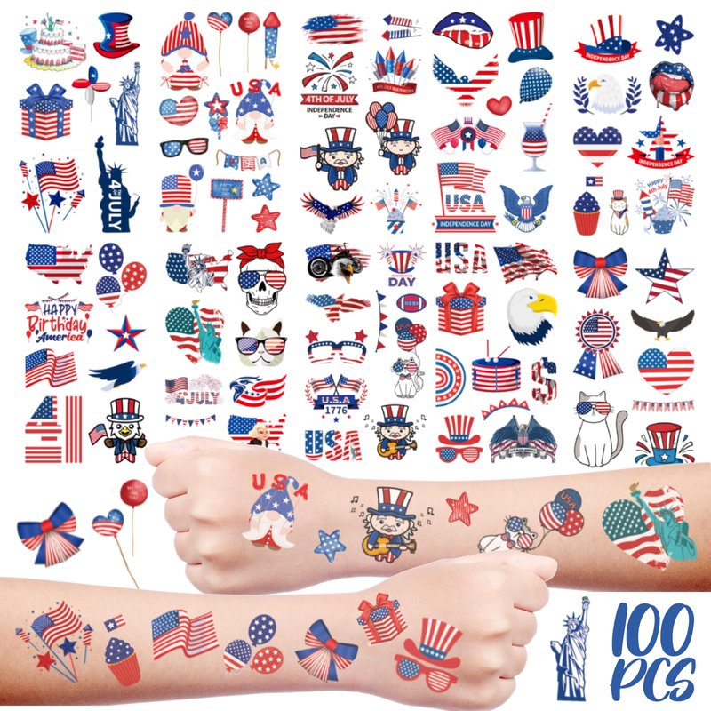 - 100 Kids Temporary Tattoo Kit - Handsome waterproof patriotic temporary tattoo. This collection of temporary tattoo stickers contains boys' favorite fun elements such as American flag, statue of liberty, eagle, American cake, etc., to increase the fun of children's parties.