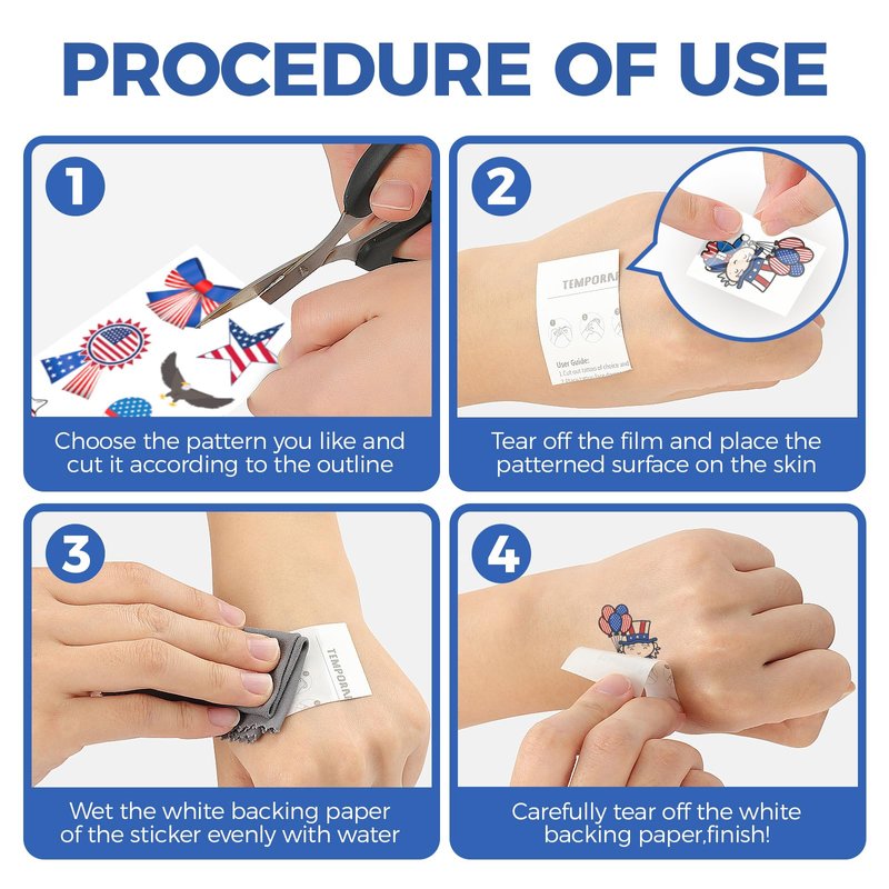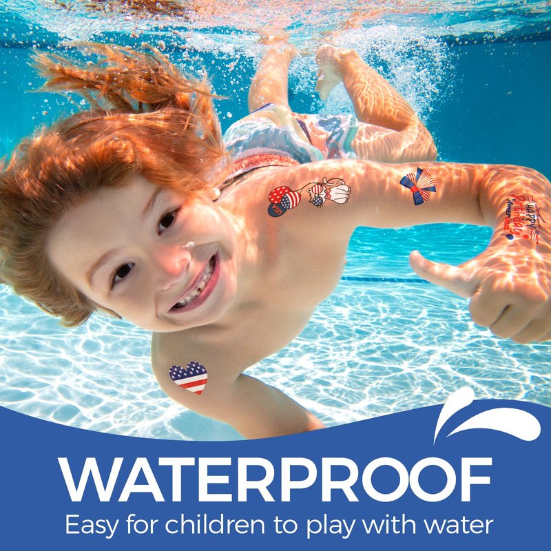 - Safe Nontoxic Kids Fake Tattoos - Our 4th of July tattoos are absolutely safe for your kids. Each tattoo is made of standard materials and environmentally friendly paper and is safe and non-toxic. These are temporary tattoos that kids can put on at will! With these fake tattoos, your child can decorate themselves with a variety of colorful patterns that can be easily washed off or ripped off later. Enjoy our removable temporary tattoos for kids.