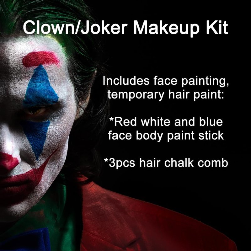 - Clown/Joker Makeup Kit for Halloween Costume Cosplay --- This face paint kit is designed for clown makeup,including face paint and temporary hair paint (1pc red face paint stick,1pc white face paint stick (thin coverage) and 1pc blue face paint stick for face painting,and 3pcs green hair chalk comb for temporary hair color).Perfect for Halloween costumes,cosplay makeup