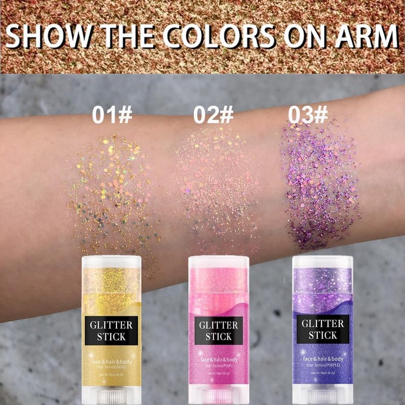 - 【Glitter Gel for Body, Face & Hair】The gold body glitter stick with fine glitters and chunky sequins, its color and shine vary in different angles, is great for glitter makeup, hair accessories, pride accessories. It delivers super vibrant and sparkling effect, looks amazing once it hits the light. Wear it to be the most attractive fan at the singer concerts.