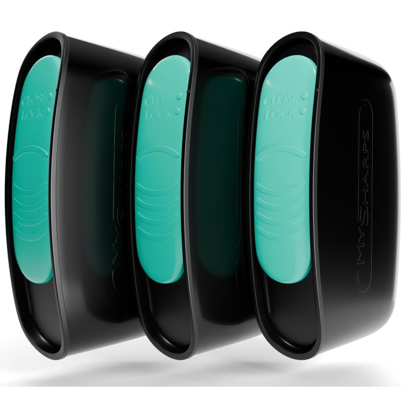 MySharps - 3-Pack Original Pocket Sharps Container for Diabetic Pen Needles & Test Strips | Compact & Portable | Small Sharps Containers for Home Use & Travel | Safe Bio-Hazard Lock | Black/Green