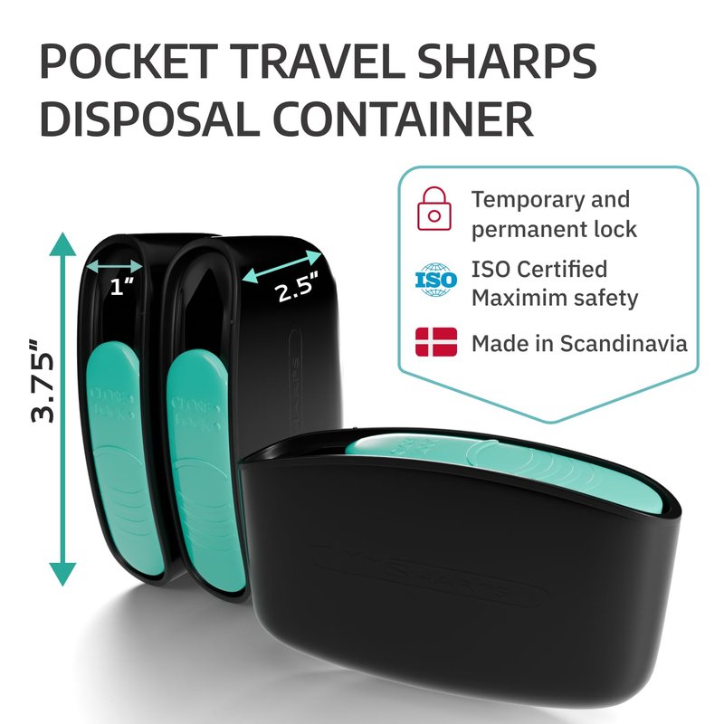 USON sharps containers for home use and travel: Worry-free disposal of diabetic pen needles and test strips—wherever life takes you. The MySharps Original Pocket Container is a discreet, travel-size sharps disposal solution designed for people with diabetes, by people who understand diabetes. Whether you're at work, in school, commuting, or traveling, this 3-pack ensures you're never without a safe place to dispose of used pen needles, lancets, or test strips. Each compact sharps disposal container fits easily into a handbag, glove compartment, or backpack pocket, making it a true travel companion. The intuitive push-in design allows for one-handed needle removal, helping reduce the risk of accidental sticks. And thanks to its certified dual-lock mechanism (temporary + permanent), you can safely seal it shut after filling. Made in Scandinavia with durable materials and tested to meet ISO 23907 standards, these sharp containers for needles are built for peace of mind. Each one can hold up to 40 used tips—perfect for daily or extended use. Whether you're newly diagnosed or managing diabetes long-term, MySharps offers the convenience, hygiene, and security you deserve—without compromise